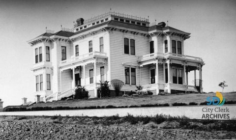 A. E. Horton's residence at First and Fir, built in 1885 and demolished in 1956. The photo was taken by Herve Friend for Douglas Gunn's 1887 book 'Picturesque San Diego'. Gunn was the 5th Mayor of San Diego. He bought the San Diego Union in 1871 and published annual reviews of the progress of the City and County in pamphlet form. For 1887's review, he was urged to document the developments in illustrated form. He contracted with the American Photogravure Company and he and Mr. Friend captured photos for the book.