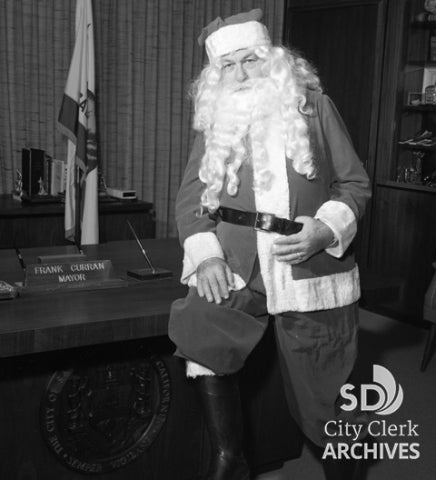 1968 photo of Mayor Frank Curran in his office dressed as Santa Claus. He was the 28th Mayor of San Diego, in office December 1963 - December 1971. During his term, the Civic Center was built and ballot issues were passed to build a new stadium in Mission Valley and a metropolitan sewer system.