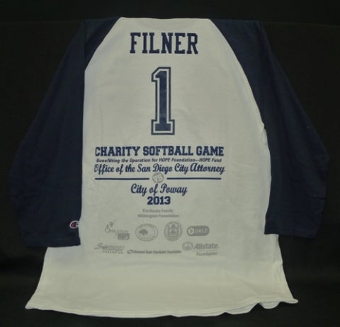 Personalized baseball shirt, white with navy blue sleeves, '3rd Annual Ready to Take the Diamond' and 'Strike Out Domestic Violence' is on the front and 'Filner 1' and 'Charity Softball Game' is on the back of the shirt. It was an annual fundraising event. The San Diego City Attorney's Office played against the City of Poway. Operation for HOPE Foundation raises awareness about domestic violence and the resources available to prevent and respond to the issue.