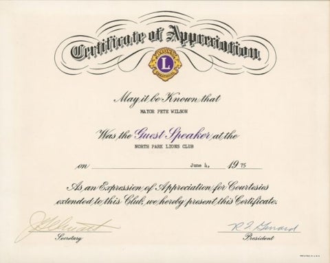 White paper 8 x 10 certificate with the seal of Lions International, reads: 'Certificate of Appreciation, May it be known that Mayor Pete Wilson was the guest speaker at the North Park Lions club on June 4, 1975. As an expression of appreciation for courtesies extended to this club, we hereby present this certificate.'
