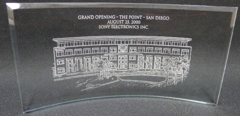 Glass plaque, 4 x 8 inches, with an image of Sony Electronics' facility 'The Point'. This was donated by Sony to the City of San Diego to commemorate the grand opening on August 25, 2000.