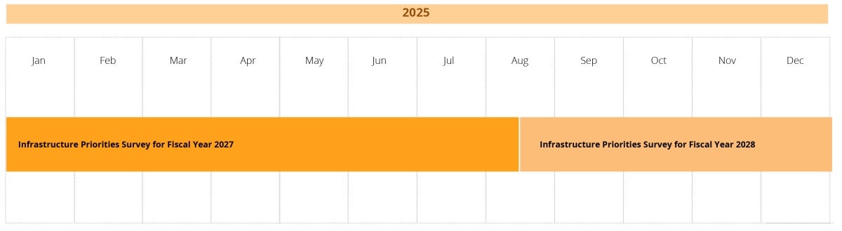 It is always a good time to tell the City about infrastructure ideas you would like to see prioritized. We are currently collecting ideas to consider for the FY2027- FY2031 Outlook. All ideas submitted until August 1, 2025, will be sent to the Asset Managing Departments for the FY2027 - FY2031 budget cycle. Please access the survey via the link below: