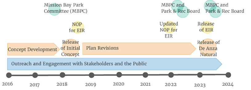 In March 2023, the City released De Anza Natural, a proposed draft amendment to the Mission Bay Park Master Plan, along with the Draft PEIR for public comment. Informational items were presented to the Mission Bay Park Committee and the Park & Recreation Board, where staff heard from a variety of stakeholders.