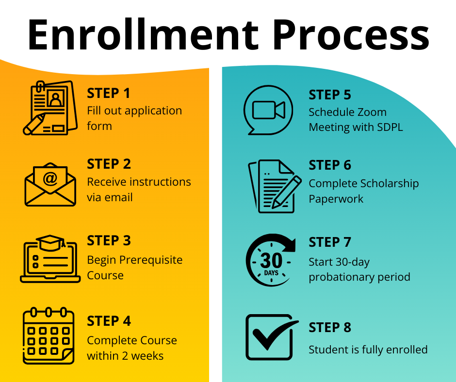 To be considered for a scholarship that covers the cost of tuition for either program, applicants must first complete an online survey and prerequisite course, followed by an information session with San Diego Public Library staff. Enrollment is open year-round. Here are the steps: