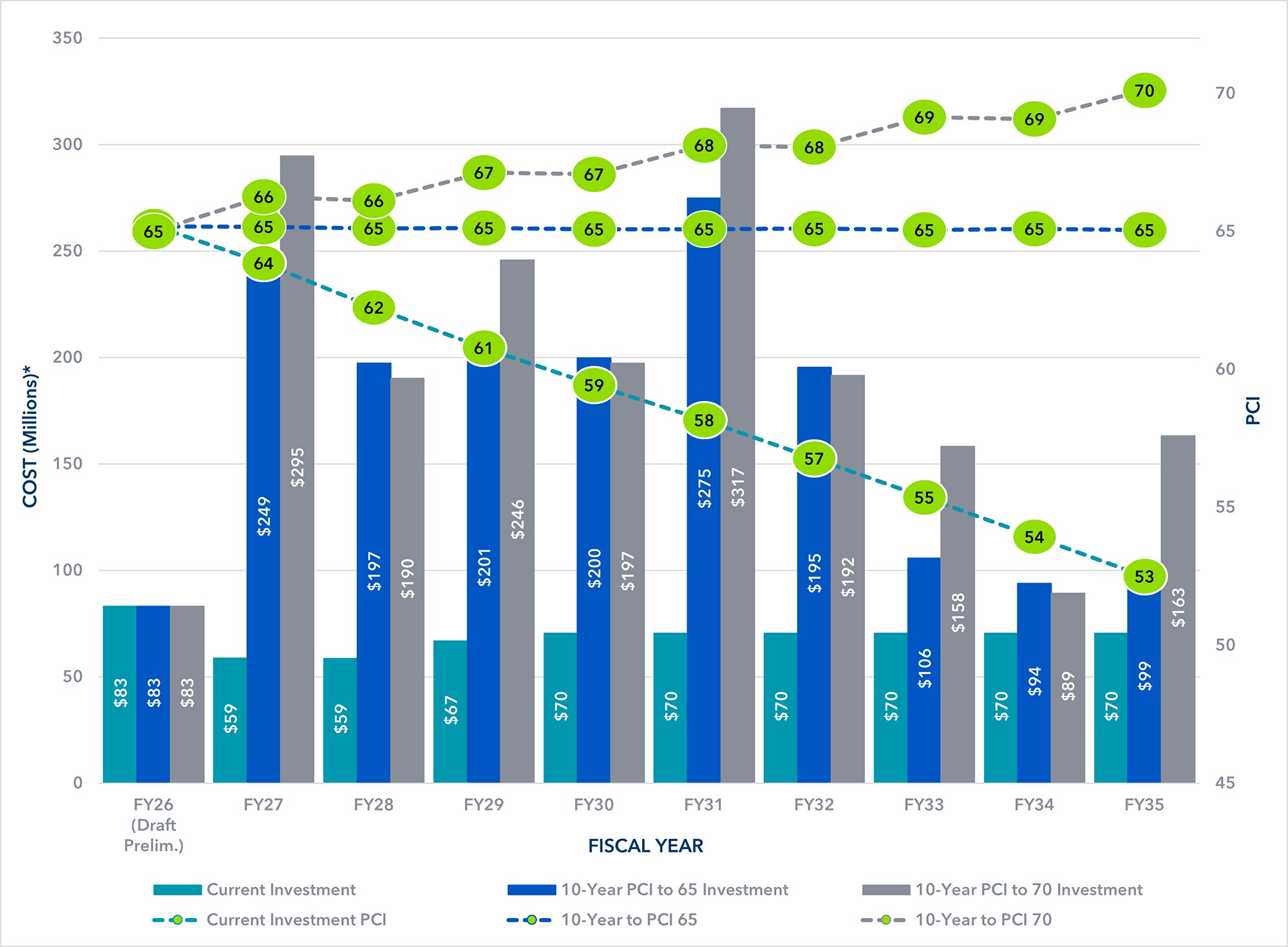 The January 2024 Pavement Management Plan incorporated a financial analysis using multiple street selection approaches to assess cost-effective and operationally viable options to achieve an average PCI 70. At that time, Department analyses determined that to maintain an average street network PCI of 70, a total investment of $1.9 billion is needed over the next 10 years.
