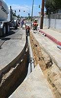In this phase, crews create a trench and install round plastic conduit below the surface of the roadway. The crews will also trench up to each of the homes and businesses at this time. This is the most community impacted phase of construction and typically can be expected to last 9 to 12 months. On average, most trenching crews can perform 100 feet of trenching or more per day, so trenching operations can be expected to be in front of any particular home or business for just a few days. During this phase, a separate electrical contractor will be working on the electrical panels of the individual homes and businesses in order to prepare them to receive the new underground service.